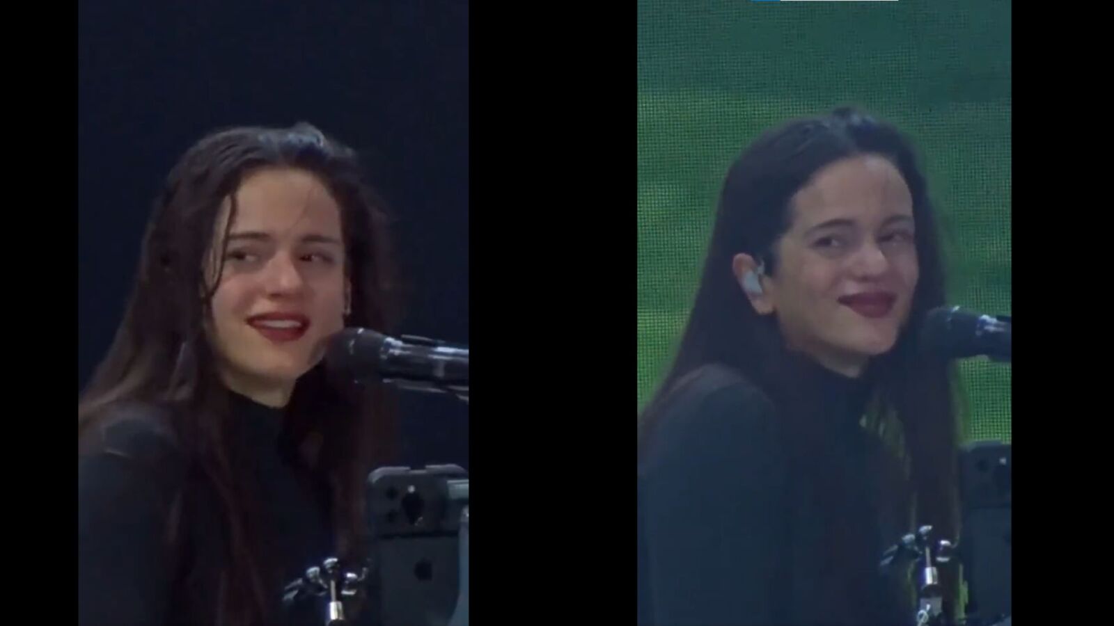 Antes de tocar la primera nota, Rosalía se limpió las lágrimas de la cara con sus manos y empezó a tocar el tema. Cuando llegó la primera palabra del verso Pa', pero mírate, se le rompió irremediablemente la voz, miró a su público con los ojos llenos de lágrimas y un rosto que gritó su dolor en silencio.