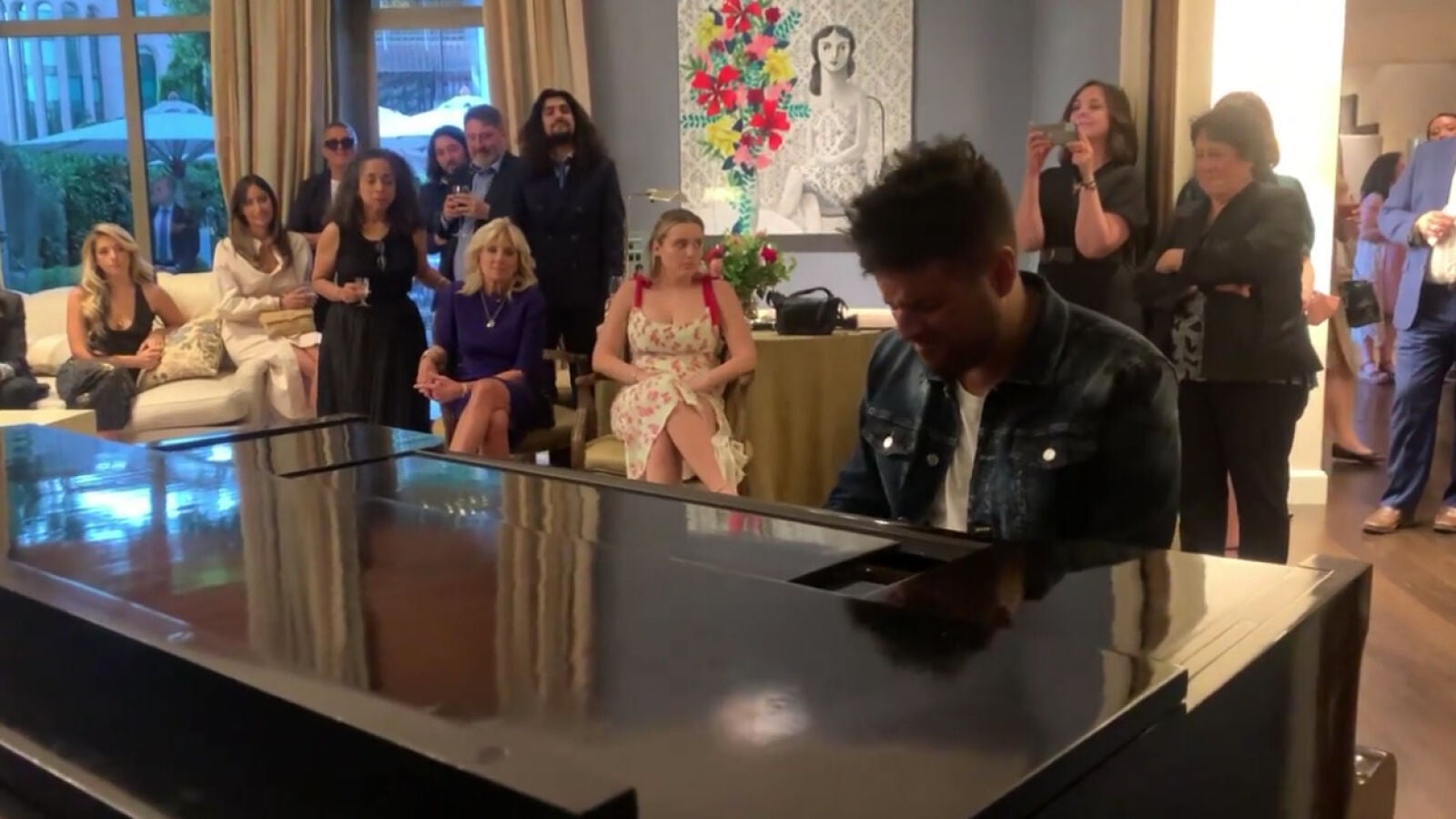 La fiesta contó con varias actuaciones en directo. Una fue de Pablo López, que interpretó al piano su canción El Patio ante la atenta mirada de la Primera Dama.