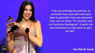 Tras una entrega de premios, la cantante Dua Lipa descubre que bajo su galardón hay una pequeña nota con un texto: "Tu nombre real es Francisca Rodríguez". A partir de ese momento su vida dará un giro de 180º, sumergiéndose en una peligrosa investigación para conocer su verdadero origen y enfrentándose a oscuros poderes a fin de disipar la pregunta que tanto le angustia: "¿Cómo pude creer todos estos años que mi verdadero nombre era algo tan disparatado como Dua Lipa?" - Falsa identidad (The wrong name)
