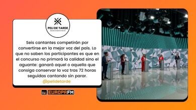 Un canal de televisión de pago estrena un nuevo concurso musical. En él, seis cantantes competirán por convertirse en la mejor voz del país. Lo que no saben los participantes es que en el concurso no primará la calidad sino el aguante: ganará aquel o aquella que consiga conservar la voz tras 72 horas seguidas cantando sin parar. Si alguno necesita atención médica, será descalificado, así como si se detienen más de 5 segundos para beber agua. Su sufrimiento será proporcional a la audiencia que generarán. — Sin voz (Deadly Contest)