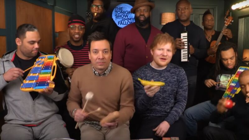 Con una especie de plátano-maraca en la mano, el momento de Ed Sheeran cantando ‘Shape of You’ junto a Jimmy Fallon y The Roots, ¡no tiene precio!