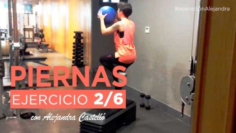Entrena las piernas con este sencillo ejercicio. Si no tienes un step sobre el que subirte, busca un escalón en casa, y para el peso, valen un par de botellas de agua pequeñas rellenas de arena para empezar. Haz de 12 a 15 repeticiones con cada pierna. Descansa 8 segundos.